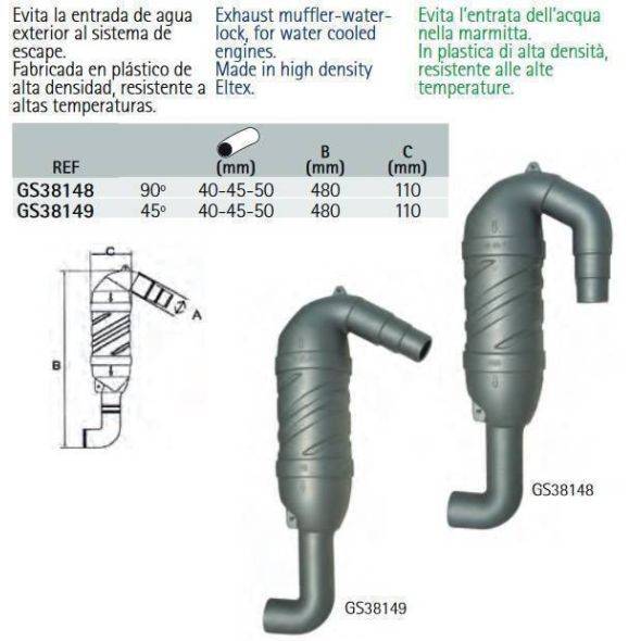 SYPHON Exhaust muffler-water lock, for water-cooled engines. Made in high-density Eltex. PICK YOUR SIZE