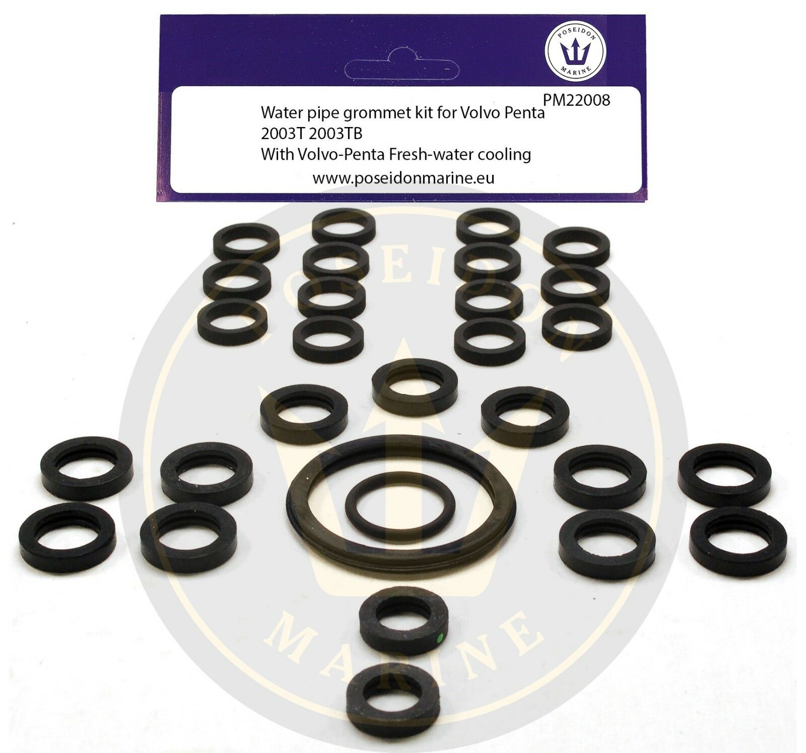 CromMarine® water pipe seal kits are the ideal solution to replace all grommets and u-rings your engine has in the cooling system, such as from and to the sea-water pump, to and from the oil cooler, heat exchanger, thermostat housing, and to the exhaust elbow. A new thermostat o-ring is also included. This kit is strongly recommended if you want to renew your rubbers in the water connection to avoid water leaks or if you are doing a major overhaul and plan to repaint/renew many things in your engine compartment. Crom Marine uses the highest quality rubbers, cut in the right shape and size, to guarantee optimal sealing.